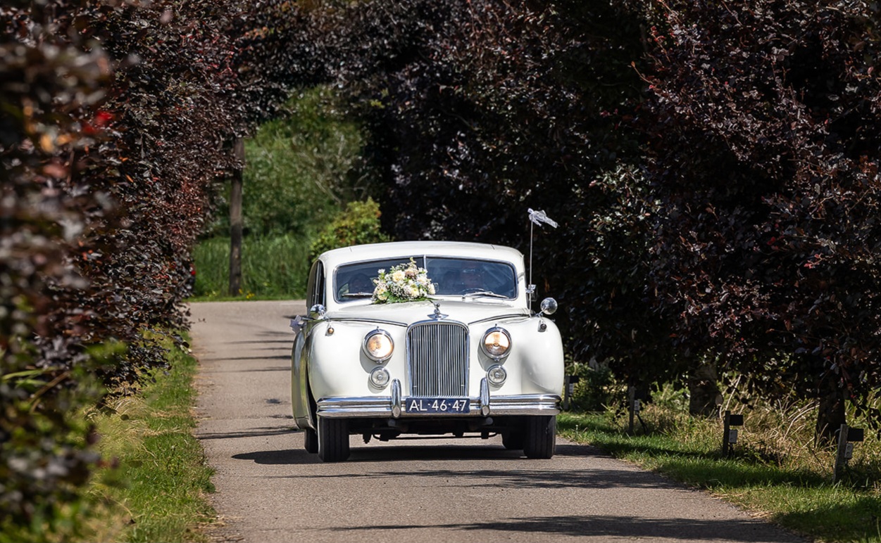 Deze Jaguar is in de jaren ‘50 geproduceerd in Engeland, het was toen de allereerste auto die 100 mijl per uur kon rijden (161 km per uur). Een unicum in die tijd! Na een uitstapje naar Amerika, mochten wij 'm vanuit een privécollectie overnemen en sindsdien is deze prachtige auto te huur voor bruiloften.